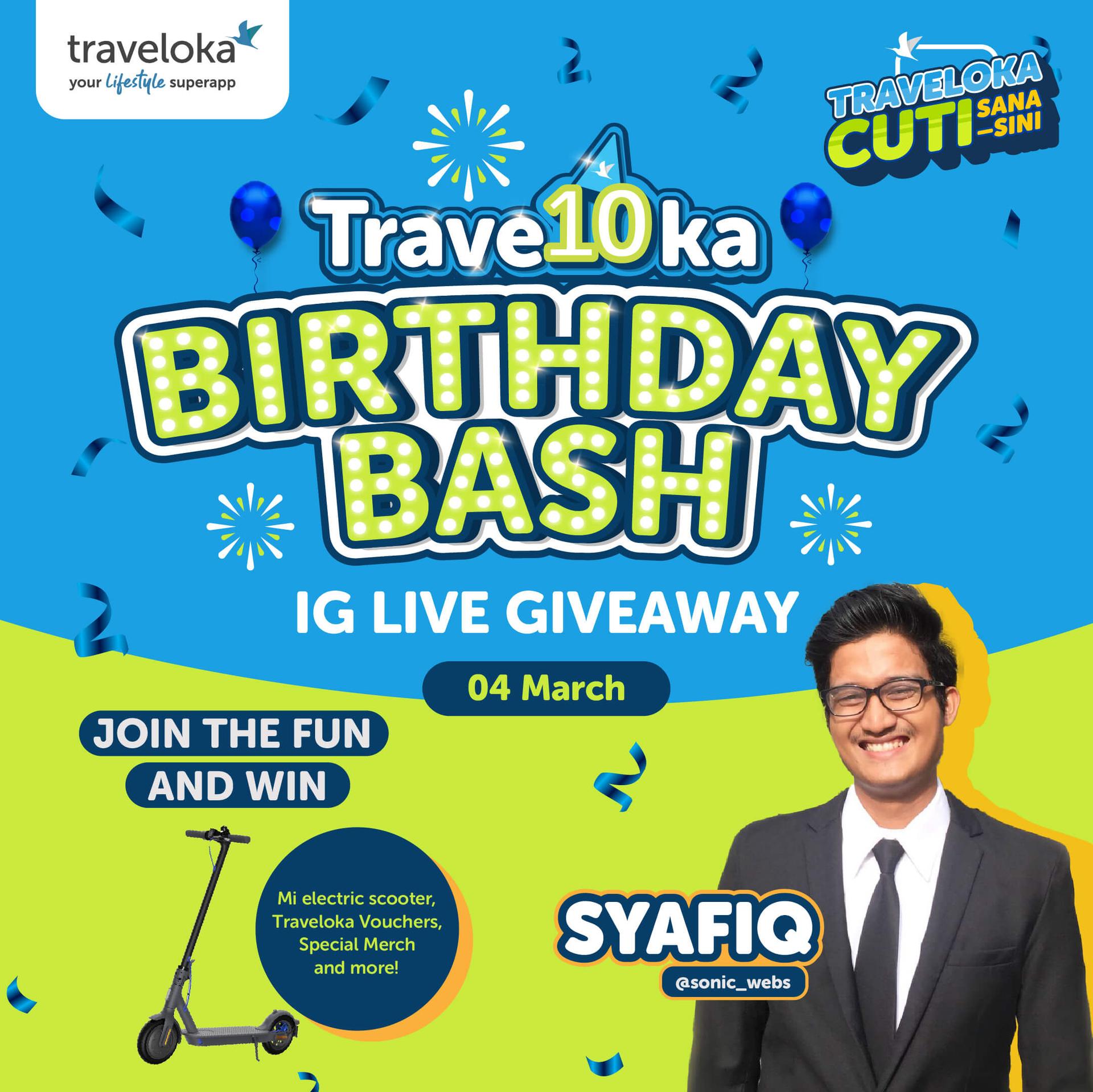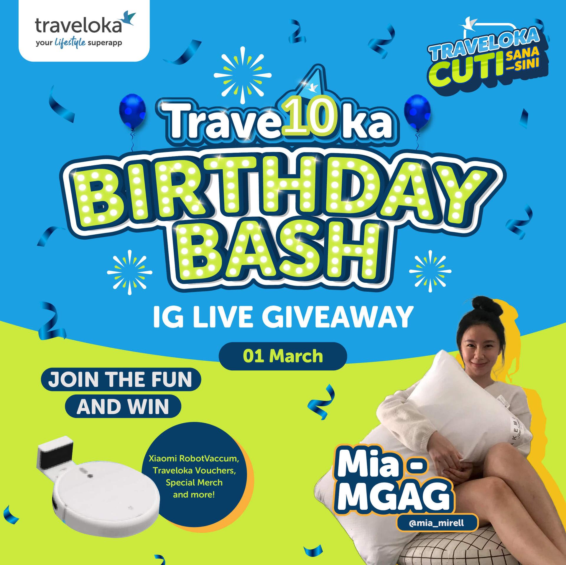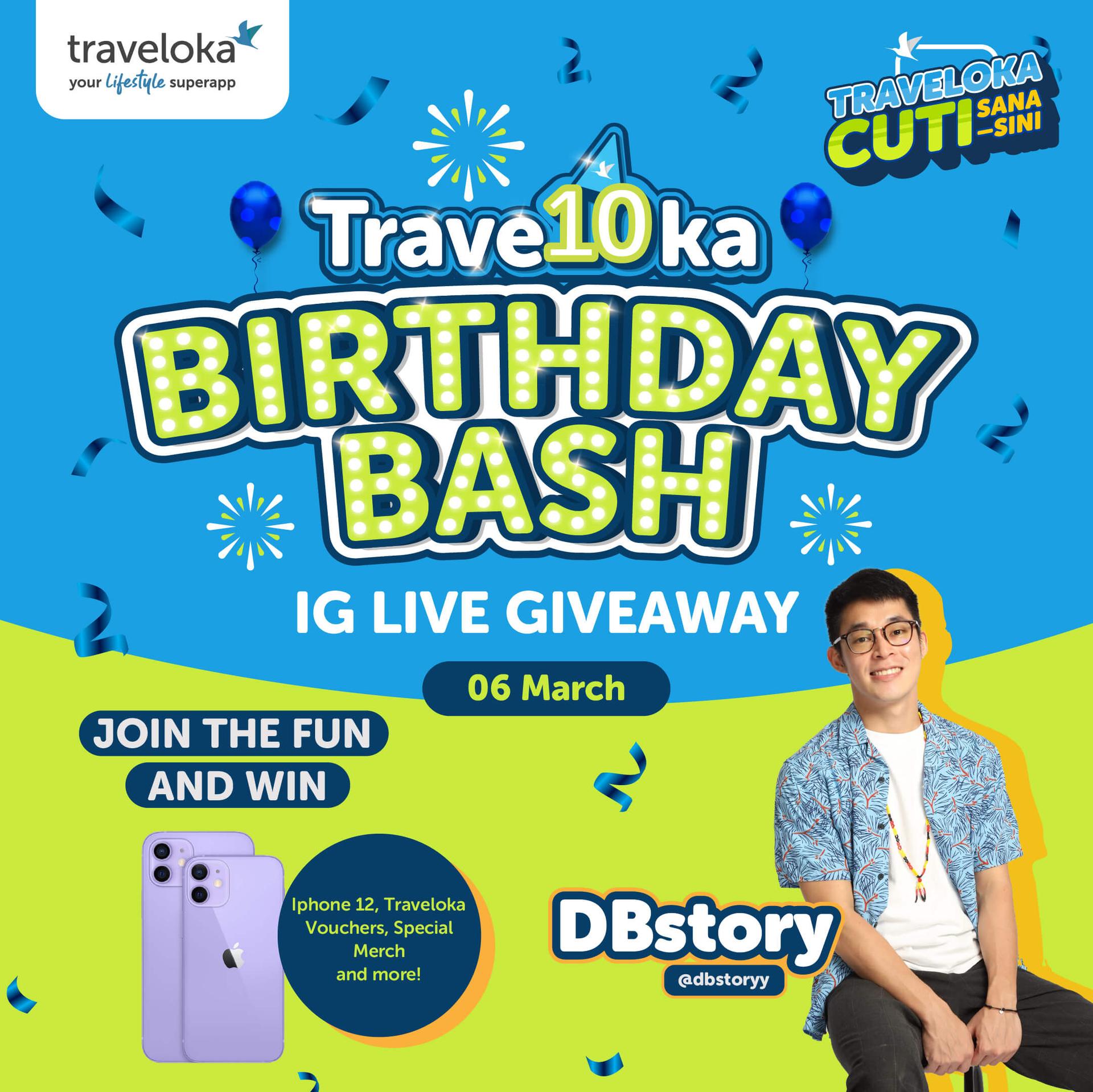 🎉 It’s Traveloka 10th Birthday Salebrat10n, and we’d like to invite you to our @TravelokaMY IG Live party at 6 PM from 28 February to 6 March every day! 📱