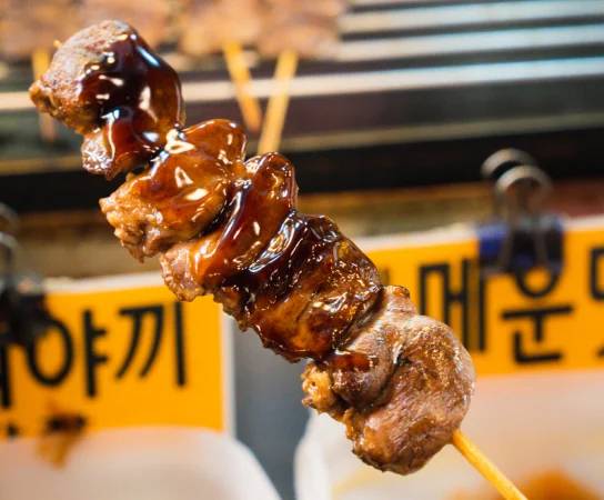 For adventurous food lovers, chicken heart skewers are a must-try in Daegu’s Seomun Market. These grilled chicken hearts on skewers are seasoned to perfection and served with a variety of flavourful sauces, offering a unique and savoury taste of authentic Korean street food.