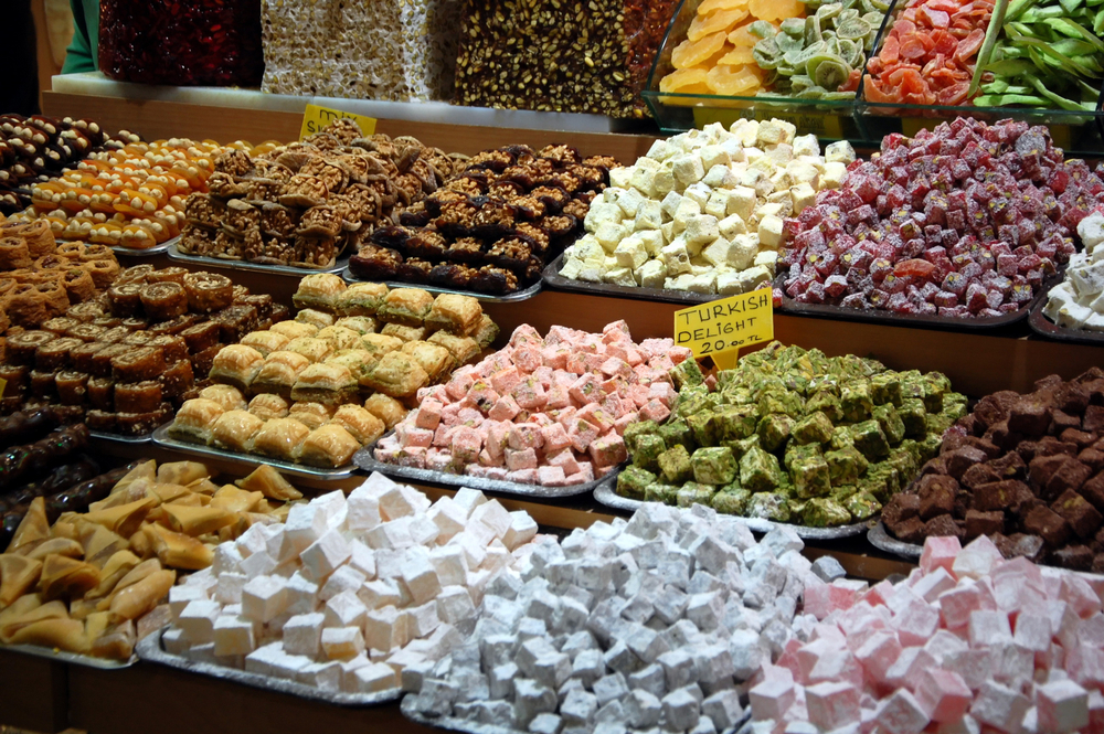 Turkish delights, atau dikenal sebagai lokum, adalah camilan manis dari Turki yang memiliki tekstur kenyal dan lembut. Dibuat dari campuran gula dan tepung maizena, lokum tersedia dalam berbagai rasa seperti mawar, lemon, pistachio, dan delima. Dessert ini sering dihidangkan sebagai suguhan bagi tamu, atau dijadikan oleh-oleh khas dari Istanbul.