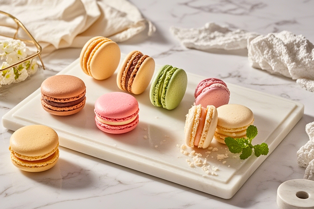 Macaroons merupakan biskuit khas Prancis yang dikenal karena tampilannya yang cantik dan warna-warna pastel yang menggoda. Terbuat dari putih telur, gula halus, dan tepung almond, macarons memiliki tekstur renyah di luar dan lembut di dalam. Di bagian tengah, biasanya diisi dengan ganache, krim, atau selai berbagai rasa seperti vanilla, cokelat, atau raspberry.