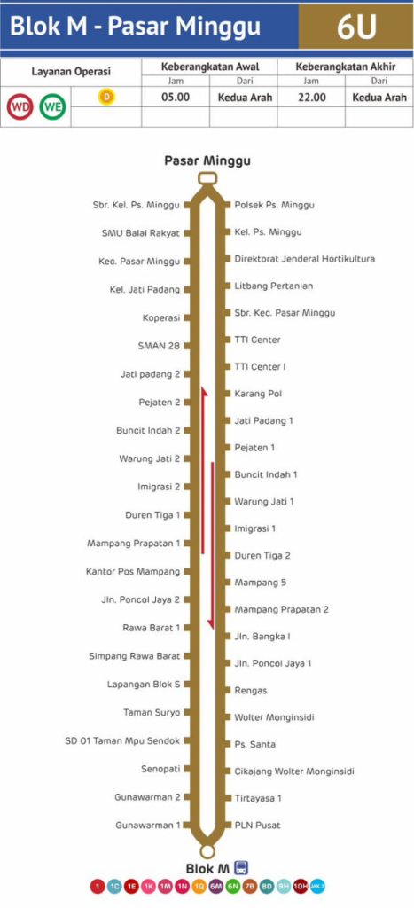 Sementara jika memulai perjalanan dari Pasar Minggu menuju Blok M bus 6U akan melalui 31 pemberhentian dengan waktu tempuh selama 56 menit. Berikut ini detail jalurnya Rute 6U dari Pasar Minggu menuju Blok M: