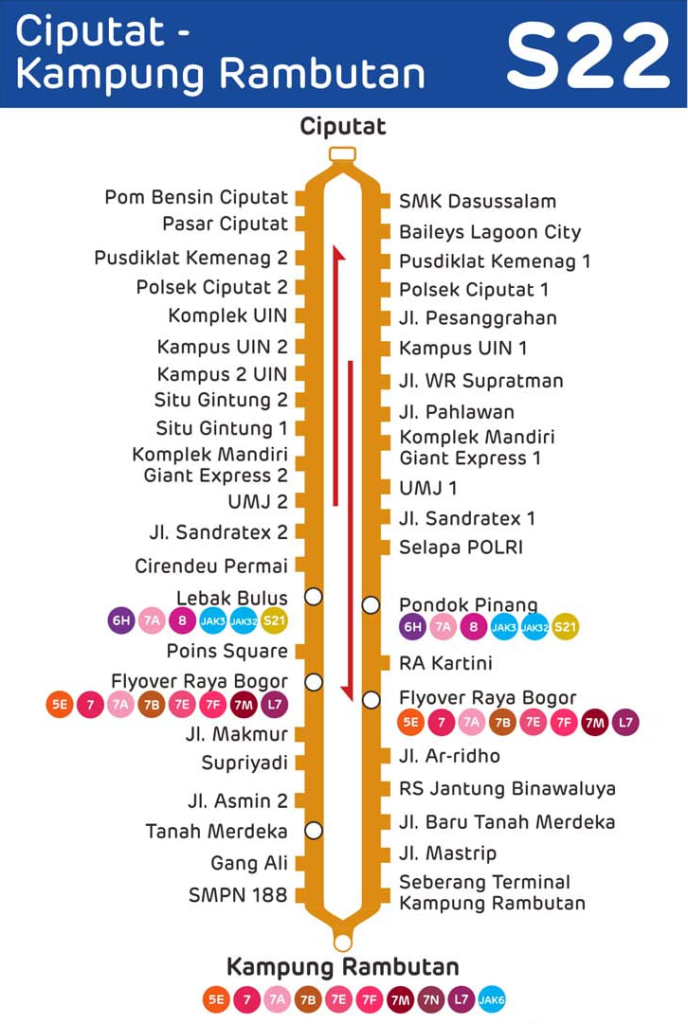 Perjalanan Rute S22 yang bermula dari Kampung Rambutan hingga di Pool PPD Ciputat dan sebaliknya, rute ini memiliki dua puluh tiga pemberhentian yang dapat dilihat dibawah ini :