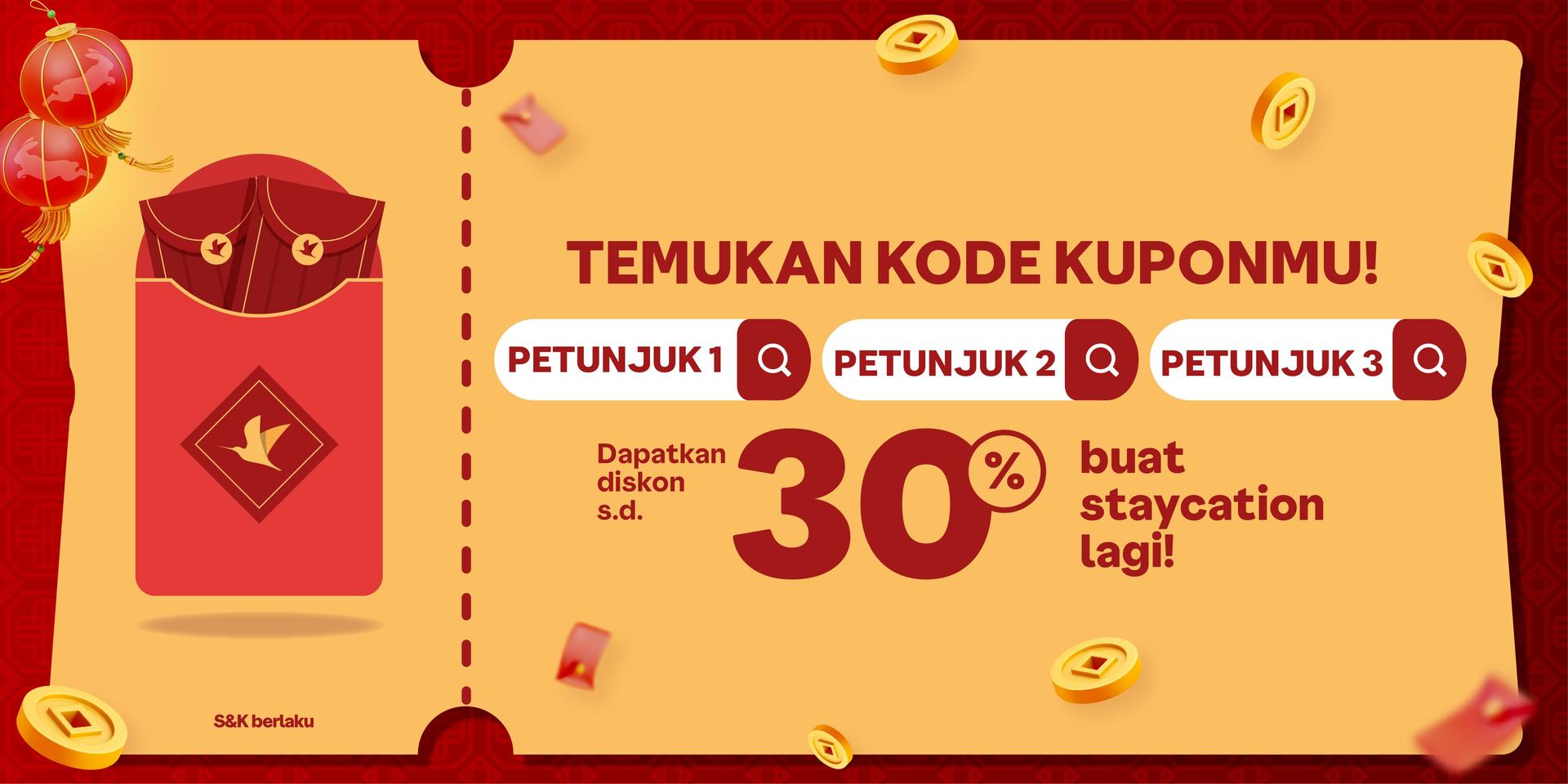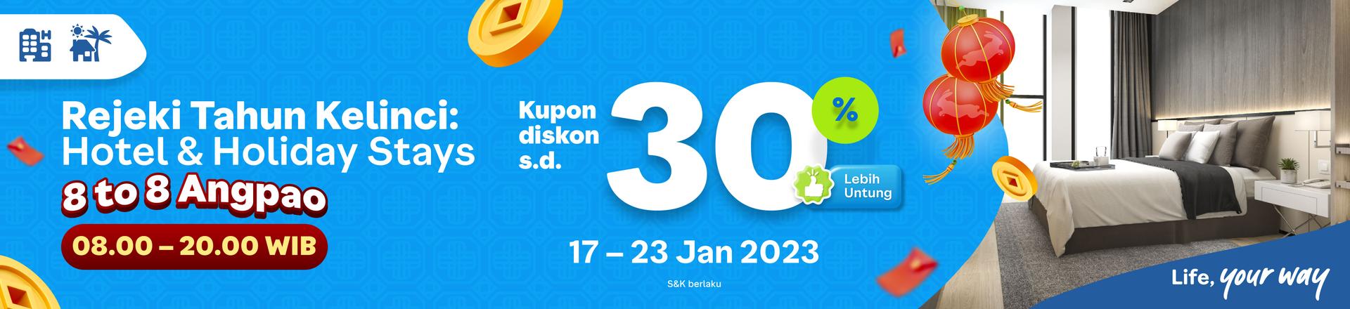 Kupon diskon 30% potongan s.d. Rp88.000 untuk pemesanan Hotel dan Holiday Stays (Vila, Apartemen, Resort, Glamping) dengan transaksi minimum Rp250.000