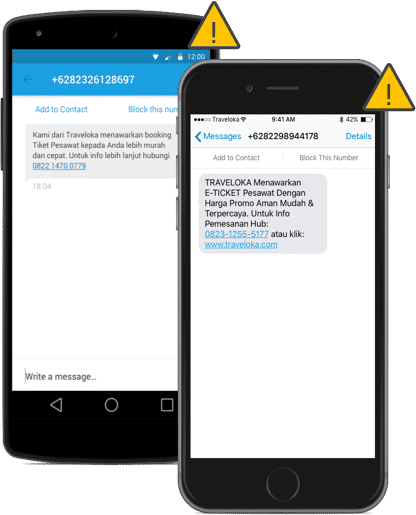 Seluruh transaksi di Traveloka hanya dapat dilakukan secara online. Lakukan pemesanan hanya lewat website www.traveloka.com atau aplikasi mobile Traveloka di Android atau iOS. Abaikan pihak yang mengaku Traveloka dan menawarkan pemesanan tiket pesawat atau hotel lewat pesan singkat SMS, BBM (BlackBerry Messenger), dan telepon. Keamanan transaksi Anda lewat website maupun aplikasi mobile dijamin oleh Traveloka.