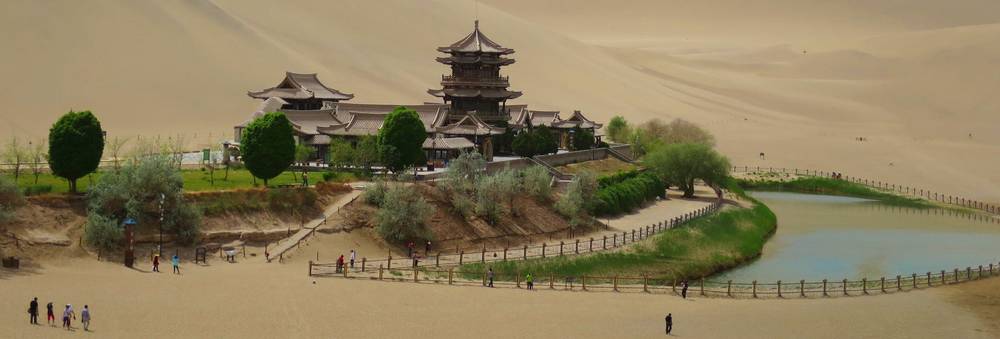 Đứng trên đỉnh cồn cát giữa sa mạc Gobi rộng lớn, bạn sẽ được ngắm nhìn trọn vẹn vẻ đẹp của hồ nước hình bán nguyệt. Hồ nước được bao quanh bởi các cồn cát, nổi bật với làn nước trong xanh màu ngọc bình. Hồ bán nguyệt từng là một phần của con sông Danghe, sau khi sông đổi dòng thì hồ nước trở nên tách biệt. Đặc biệt, ở trên ốc đảo còn có nhiều công trình cổ và dấu tích của các thương nhân Ả, Rập, Ấn Độ xưa.