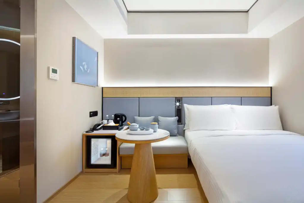 客房虽然不大,但设备先进,现代装潢,确保你的舒适入住体验。每间客房都布置现代,墙壁色彩明亮,而且贴心地安装了床边插座,方便你随时充电。此外,还备有迷你吧,可供选择中文或国际频道观看。